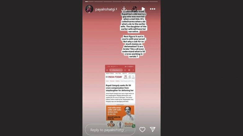 Payal Rohatgi, who is known for her bold and unfiltered opinions on social media, took to her Instagram stories and lashed out at Rupali Ganguly. She wrote, "Whatever your truth Rupali, but you did marry a guy who was married when you met him. Its called karma when you do what you do to the earlier wife. The daughter of the earlier wife will have her narrative." She continued, "Rest figure it out in courts with your proof. But why did you ask so much money as defamation? Are you broke? Do you all even understand what is 50 crores working in serial?"