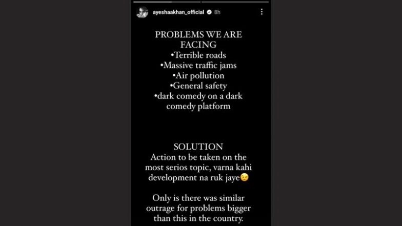 Ranveer Allahbadia's comments on Samay Raina's show have attracted strong reactions from celebs. Among them was Bigg Boss fame Ayesha Khan, who took an indirect dig at the authorities amid the controversy. Taking to her Insta stories on Tuesday (February 11), she wrote, "Problems we are facing - terrible roads, massive traffic jams, air pollution, general safety, dark comedy on a dark comedy platform."She further added, "Solution - Action to be taken on the most serious topic, varna kahin development na ruk jaye. Only if there was a similar outrage for problems bigger than this in the country."