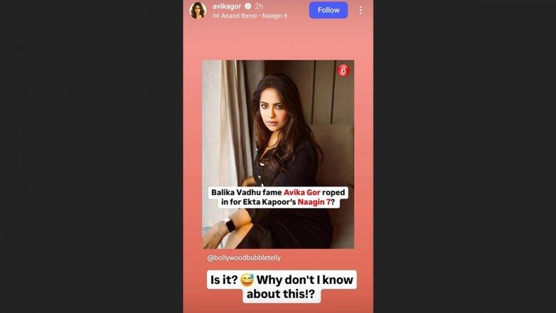 According to several reports on the internet, actress Avika Gor of Balika Vadhu fame has been approached to play the new Naagin. If everything goes well, the 27-year-old actress will play the lead role in Ektaa Kapoor's supernatural show about shape-shifting serpents. However, Avika Gor has now come forward and reacted to the rumours on social media. Taking to her Instagram stories on Sunday (March 2), the actress reshared a post about her casting in Naagin 7 and wrote, "Is it? Why don't I know about this?"