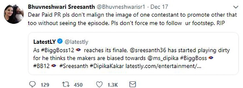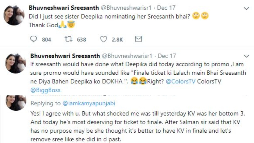 And leading the charge seemed to be Sreesanth’s wife Bhuvneshwari. The lady did not say things directly about Dipika, but was seen subtly taunting the lady for not siding with Sreesanth. See Bhuvneshwari’s tweets below.