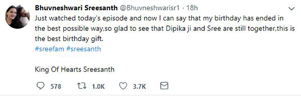 However, Bhuvneshwari did tweet at the end of the episode that she was indeed very glad that Sreesanth and Dipika had patched up and were very much together.