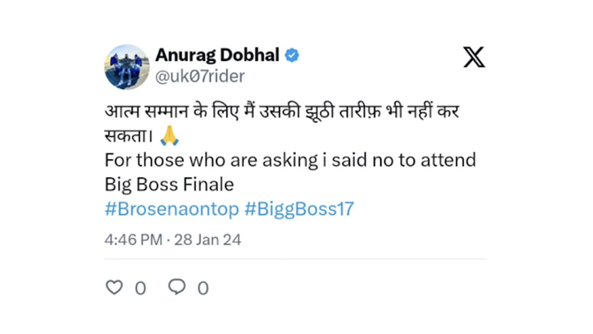 Former Bigg Boss 17 contestant and Youtuber Anurag Dobhal has revealed the reason for skipping the much-awaited Bigg Boss 17. He said it is due to “self respect”. In a cryptic post on Instagram, Anurag shared: “Atma samman ke liye main uski jhoothi tareef nahi kar sakta.. For those who are asking I said no to attend Bigg Boss finale. #brosenaontop #biggboss17.” Bigg Boss 17 Finale: Munawar Faruqui and Mannara Chopra Set the Stage Ablaze with Their Moves to Kartik Aaryan and Sara Ali Khan's 'Haan Main Galat' Song From Love Aaj Kal (Watch Video).