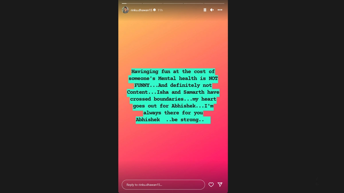 Rinku added that Samarth even poked her, when she was in the house and found it very disrespectful. “Samarth even poked me, and it was very disrespectful. Ankita supported me, calling it bullying, but why didn't Vicky say anything then? Mental health is not a joke, and Samarth and Isha need to understand that going to a psychiatrist is seeking help. #bbiz # mentalhealthisimportant,” she concluded.