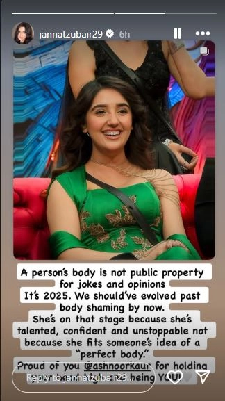 Mumbai, October 28: Popular television actress Jannat Zubair has come in support of 'Bigg Boss 19' contestant Ashnoor Kaur after housemates Kunickaa Sadanand, Tanya Mittal, and Neelam Giri body shamed her during a recent episode of the reality show. Taking to the Stories section of her Instagram handle, Jannat penned, "A person's body is not public property for jokes and opinions. It's 2025. We should've evolved past body shaming by now. She's on that stage because she's talented, confident and unstoppable not because she fits someone's idea of a "perfect body". Proud of you @ashnoorkaur for holding your head high and being You! (white heart emoji. (sic)"