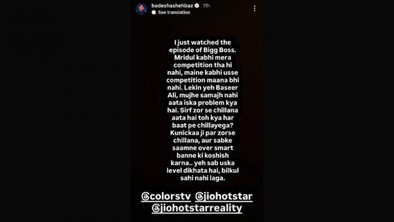 Shehbaz wrote, "I just watched the episode of Bigg Boss. Mridul kabhi mera competition tha hi nahi, maine kabhi use competition mana bhi nahi. Lekin ye Baseer Ali, mujhe samajh nahi aata iska problem kya hai. Sirf zor se chillana aata hai, toh kya har baat par chillayega? Kunickaa ji ki saamne zor se chillana, aur sab ke saamne oversmart banne ki koshish karna... yeh sab uska level dikhata hai. Bilkul sahi nahi laga." ‘Bigg Boss 19’: Kunickaa Sadanand Shares Her Hesitations Before Saying Yes to Salman Khan’s Show.
