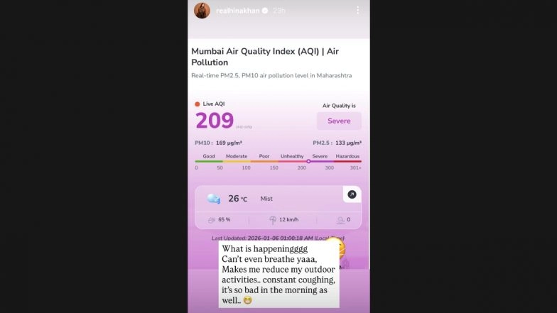 Polluted air continues to hamper the daily life of people living in Mumbai, and popular television actress Hina Khan is no exception. Sharing her health update on social media, the Yeh Rishta Kya Kehlata Hai actress revealed that she is having a hard time breathing, thanks to the deteriorating air quality in the city. Hina Khan Opens Up About Her Cancer Journey, Says ‘It’s the Way You Look at It’ While Speaking About Chemotherapy, Pain, Hope and Finding Joy on Good Days (Watch Video).