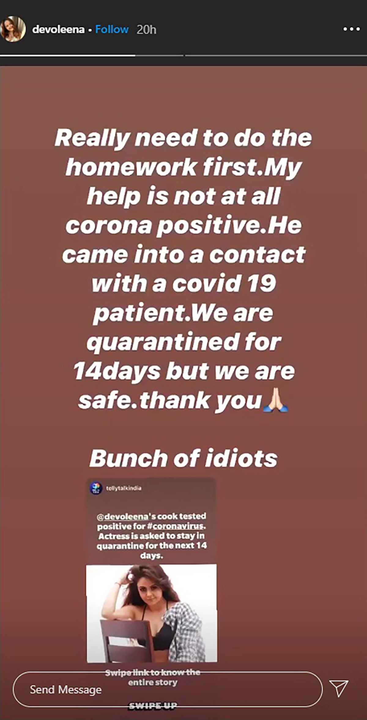 Actress Devoleena Bhattacharjee was recently in the news for her Goregaon building being sealed and declared as a containment zone by the BMC after a resident tested positive for COVID-19. However, as per certain reports, it was claimed that Devoleena's cook had tested positive for COVID-19 and that she was also placed under quarantine. But that is not true. Devoleena Bhattacharjee, in an Instagram, clarified that her house help was not COVID-19 positive, but he was placed under quarantine because he worked for the same family whose member who was affected by the pandemic. Bigg Boss 13’s Devoleena Bhattacharjee to Observe 14-Days Quarantine After Her Cook Tests Positive for COVID-19.
