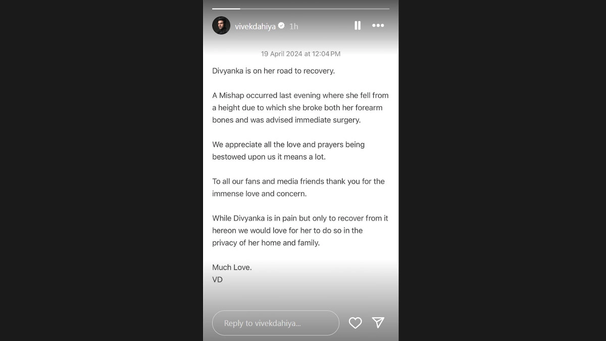 On Friday, Vivek took to his Instagram stories and penned a note, giving an update about his ladylove's health. The note read: "Divyanka is on her road to recovery. A mishap occurred last evening where she fell from a height, due to which she broke both her forearm bones and was advised immediate surgery. We appreciate all the love and prayers being bestowed upon us. It means a lot." "To all our fans and media friends, thank you for the immense love and concern. While Divyanka is in pain but only to recover from it here on we would love for her to do so in the privacy of her home and family. Much Love. VD," added the note. Divyanka Tripathi Shares A Photo Of Herself Watching Sunset, Says ‘For Me It’s a Poetry’.