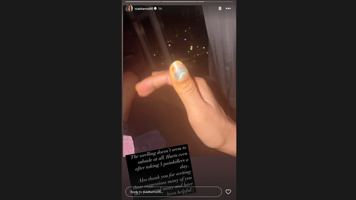 Popular television star Nia Sharma has revealed that she is taking “five painkillers a day” due to a swelling on her thumb. Nia took to her Instagram stories, where she shared a glimpse of her thumb, which is swollen and is blue. Nia Sharma Faces Backlash Over Instagram Post Promoting Vaginal Tightening Supplements, Netizens Call It ‘Unscientific Nonsense’ (Watch Video).