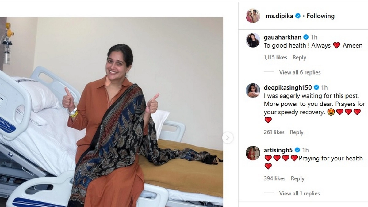 TV actresses Gauahar Khan, Arti Singh, Deepika Singh and Ridhima Tiwari reacted to Dipika Kakar's successful surgery by commenting on her Instagram post. Gauahar Khan said, "To good health ! Always ❤️ Ameen". Actress and Krushna Abhishek's sister Arti Singh wrote, "❤️❤️❤️❤️Praying for your health ❤️." Actress Deepika Singh said, "I was eagerly waiting for this post. More power to you dear. Prayers for your speedy recovery. 😍❤️❤️❤️❤️". Actress Ridhima Tiwari commented, "Health is wealth ❤️ God is kind ❤️🙌". TV actor Alan Kapoor remarked, "This is amazing ♥️ I have full faith aagay ki recovery bhi itni hi amazing hogi 🤗". Celebrity MasterChef 2025 participant Rajiv Adatia simply posted five heart emojis : "❤️❤️❤️❤️❤️". Actress Kajol Srivastav wrote: "More power to you dipi❤️ like we always say sab bahut acha hoga ❤️ Dheer saari prayers and love for you …humesha yunhi muskurati rehna."