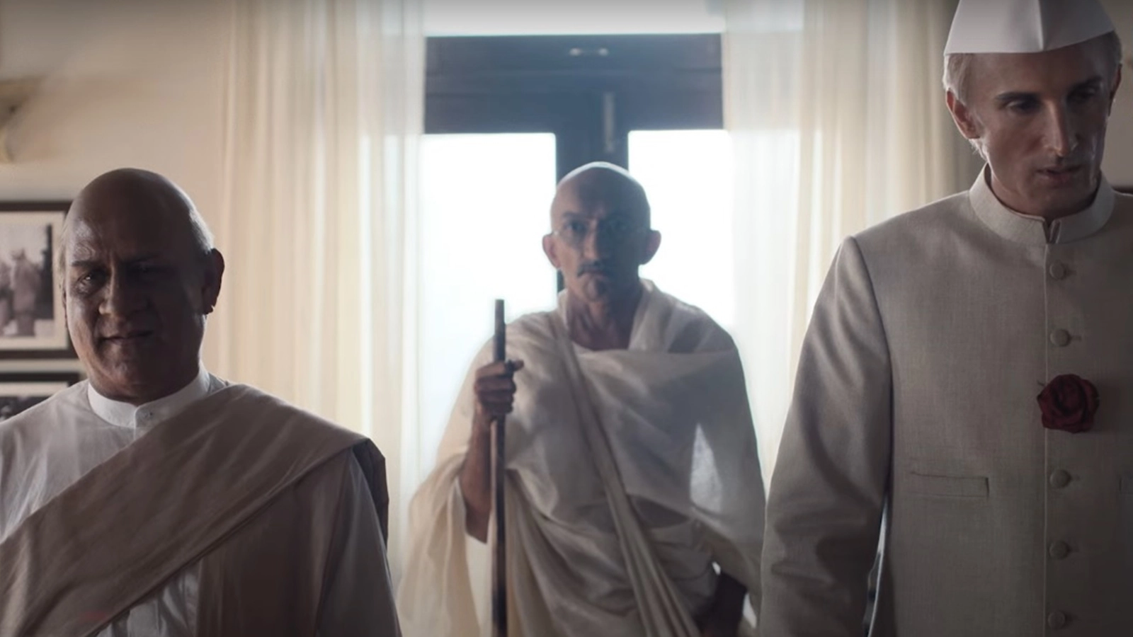 Chirag Vohra convincingly portrays Mahatma Gandhi, capturing his speech patterns, body language, and emotional turmoil in his final years. Arif Zakaria impressively conveys Jinnah’s cold arrogance without slipping into caricature. Malishka Mendonsa (Sarojini Naidu), Ira Dubey (Fatima Jinnah), Rajesh Kumar (Liaquat Ali Khan) are other prominent Indian actors in the cast. However, the makeup for some of the actors, including Siddhant, leaves much to be desired. I mean, Malishka hardly looks like Sarojini Naidu.