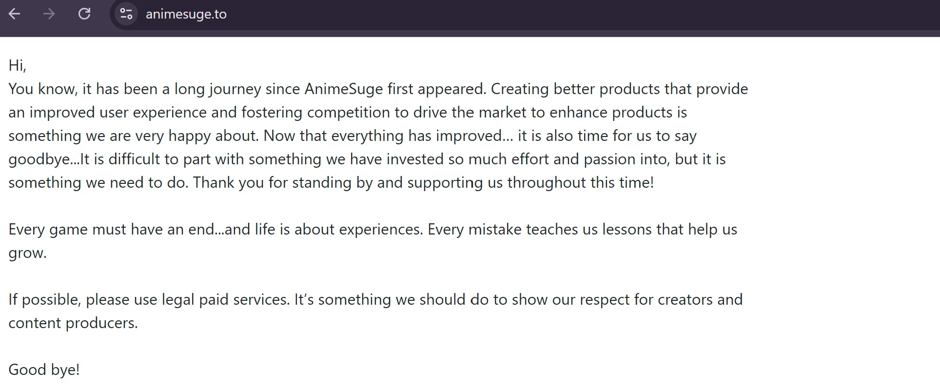 A couple of websites cannot be accessed by the users, while some other sites are showing a shutdown message. Like for example, if you open animesuge.to, you will be greeted with the message that "Creating better products that provide an improved user experience and fostering competition to drive the market to enhance products is something we are very happy about. Now that everything has improved… it is also time for us to say goodbye...It is difficult to part with something we have invested so much effort and passion into, but it is something we need to do. Thank you for standing by and supporting us throughout this time! Every game must have an end...and life is about experiences. Every mistake teaches us lessons that help us grow."