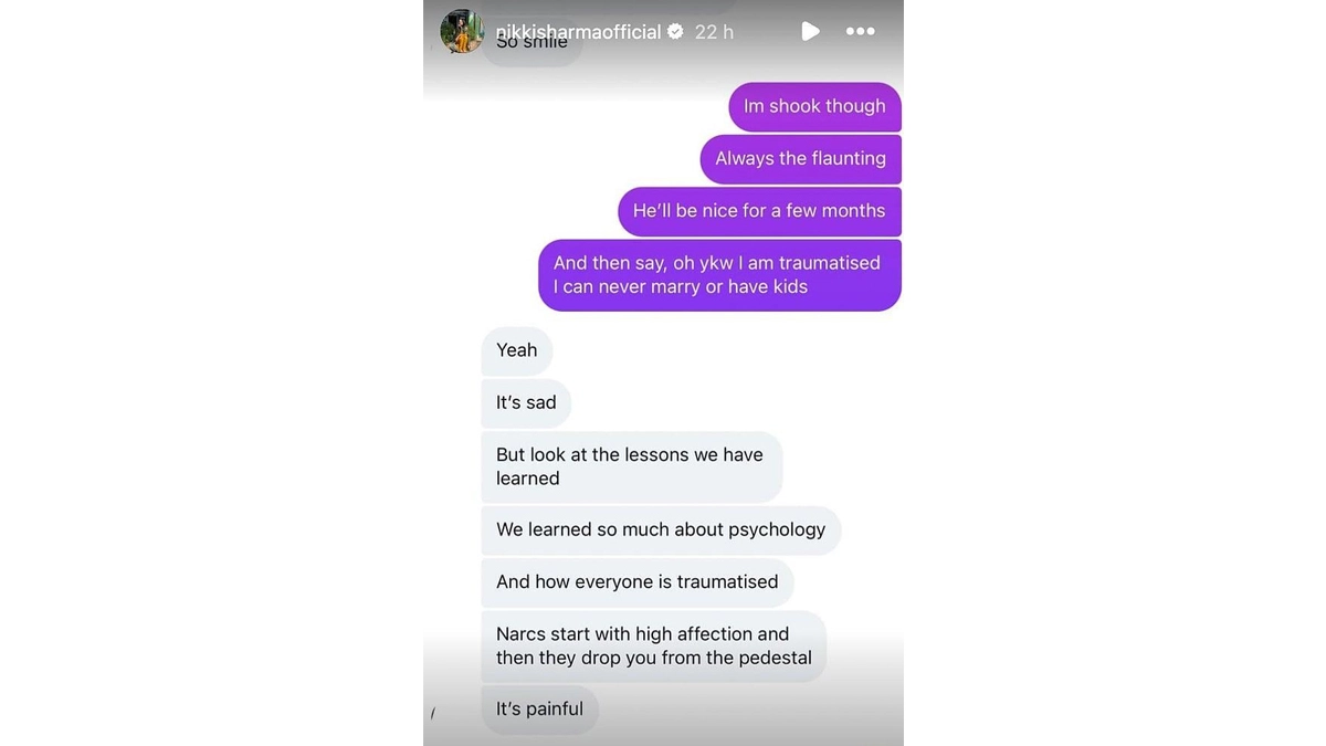 In the screenshot, Nikki's messages read, "I'm shook though. Always the flaunting. He'll be nice for a few months. And then say, 'Oh, you know what, I am traumatised. I can never marry or have kids'." In their reply, the other person texted, "Yeah, its sad. But look at the lessons we have learned. We learnt so much about psychology and how everyone is traumatised. Narcs start from high affection and then they drop you from the pedestal. It's painful."