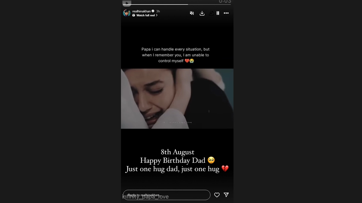 On the birth anniversary of her father, actress Hina Khan shared a heart-touching video remembering her dad, and wishing for his 'one hug'. Hina, who is currently undergoing chemotherapy for Stage 3 breast cancer, took to Instagram Stories, where she has 20.2 million followers, and shared a video with the tagline: "Papa I can handle every situation, but when I remember you, I am unable to control myself." Sharing the video, Hina wrote: "8th August... Happy birthday dad... just one hug dad, just one hug", followed by a crying face and broken heart emojis. Hina Khan Shaves Head During Stage 3 Breast Cancer Battle; ‘Yeh Rishta Kya Kehlata Hai’ Actress Courageously Says Goodbye to Her Pixie Cut (Watch Video).