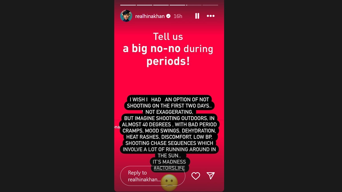 Actress Hina Khan has opened up about how if only she had an option of not shooting during the first two days of periods and described it as “madness.” Hina took to Instagram, where she re-shared a post, which had “tell us a big no-no during periods!” “I wish I had an option of not shooting on the first two days,” she wrote. She then described “an actor's life” and wrote: “Not exaggerating.. But imaging shooting outdoors.” Hina Khan Opens Up About Work Exhaustion; Actress Writes ‘Sleep-Deprived but Alive!’.