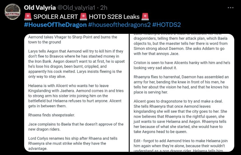 Post Sharing Leaked Plot Details From 'HOTD' S2 Finale