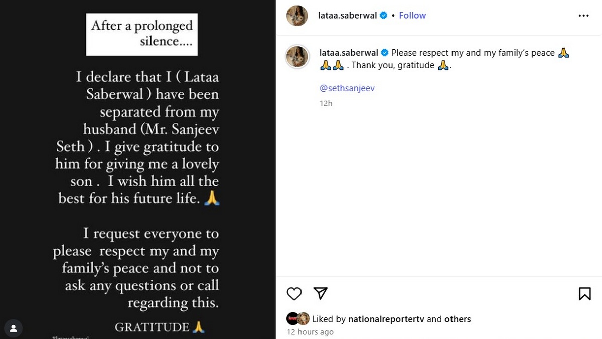 Renowned television actress Lataa Saberwal left the netizens shocked as she announced her separation from her husband, actor Sanjeev Seth after 15 years of marriage through a social media post. Taking to her Instagram handle, Lataa wished her estranged husband for his future. Her heartfelt post read, "After prolonged silence...I declare that I (Lataa Saberwal) have been separated from my husband (Mr. Sanjeev Seth). I give gratitude to him for giving me a lovely son. I wish him all the best for his future life." Asking for privacy during this challenging time in her life, she added, "I request everyone to please respect my and my family’s peace and not to ask any questions or call regarding this. GRATITUDE." "Please respect my and my family’s peace. Thank you, gratitude," Lataa captioned the post. 'Yeh Rishta Kya Kehlata Hai' Actress Lataa Saberwal Announces Separation from Husband Sanjeev Seth.