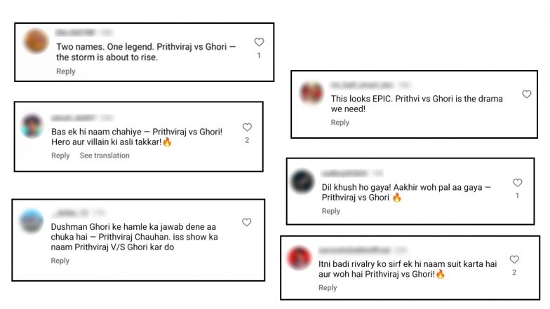 A user commented under the post, "Dushaman Ghori ke hamle ka jawaab dene aa chuka hai - Prithviraj Chauhan, is show ka naam Prithviraj vs Ghori kar do," while another wrote, "Itni badi rivalry ko bas ek hi naam suit karta hai aur wo hai Prithviraj vs Ghori". Another netizen wrote, "This looks epic. Prithviraj vs Ghori is the drama we need!"