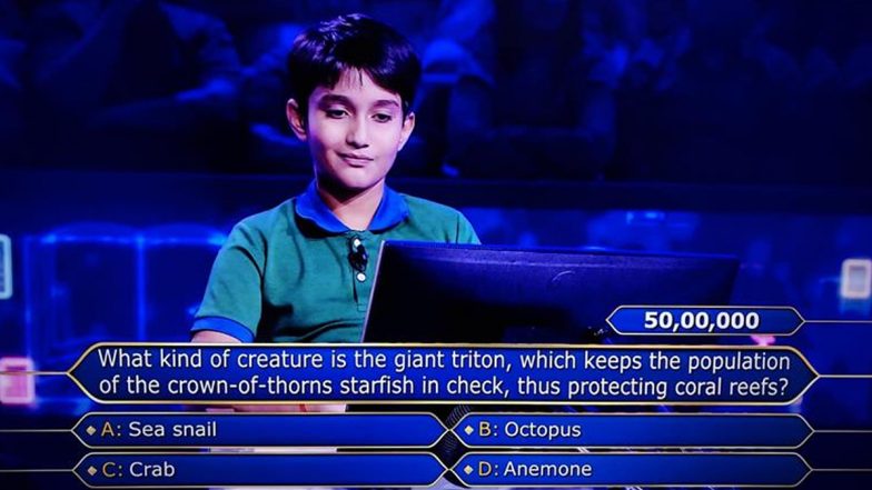 The challenging INR 50 lakh point question was: What kind of creature is the giant triton, which keeps the population of the crown-of-thorns starfish in check, thus protecting coral reefs?