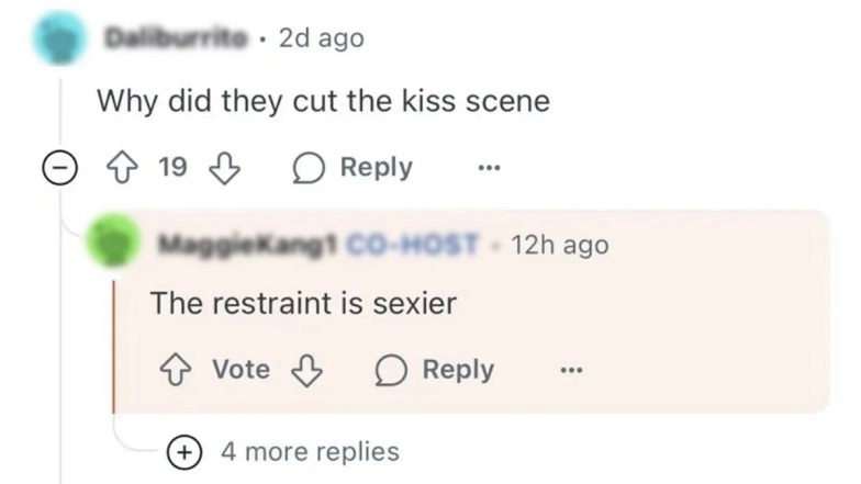 While responding to a fan's question about a removed kiss scene, Maggie Kang confirmed that there was a kiss between Rumi and Jinu in K-Pop Demon Hunters, but it was deliberately taken out. She explained that the calmness in their relationship conveyed more than actually showing the moment. In simpler terms, what she meant was, in this case, less was more. When a fan wrote, "Why did they cut the kiss scene?" director Kang replied, "The restraint is sexier." BTS Is Back! K-Pop Supergroup Reunites for First OT7 Live in 3 Years, Teases New Album Release in Spring 2026 and World Tour (Watch Videos).