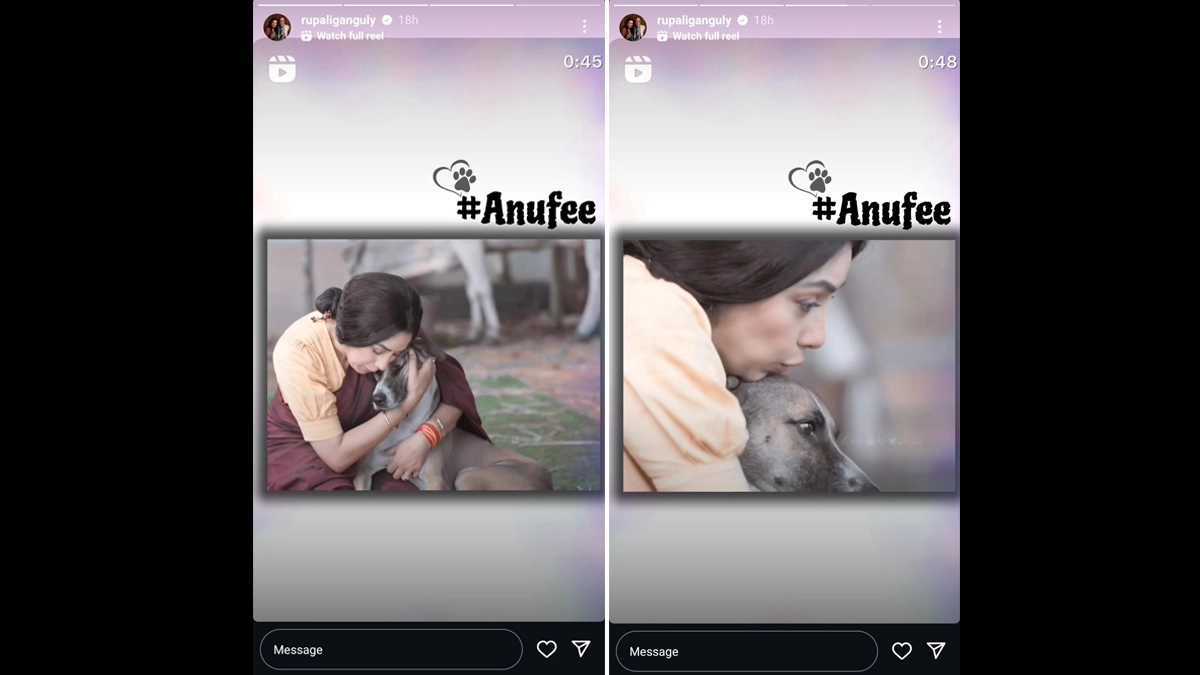 Actress Rupali Ganguly, who stars as the titular character in Anupamaa, has revealed her "nap buddy" on the sets of the show, and it is her furry friend. Taking to Instagram, Rupali, who has three million followers, shared a video on her Stories section offering a glimpse of her vanity room. The snippet shows Rupali in a saree, sleeping next to a dog she cares for on the Anupamaa set. In another video, Rupali is seen carrying the dog on her lap, captioned “Meri godh wala bachcha (My lap baby)." Anupamaa Actor Rupali Ganguly Urges Fans ‘Not To Drag Families’ Amid Controversial Video Featuring Gaurav Khanna’s Wife Akanksha Chamola.