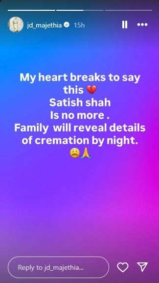 Mumbai October 25: The maker of the popular show "Sarabhai vs Sarabhai" JD Majethia mourned the loss of actor Satish Shah. Expressing his grief, JD penned on his Insta Stories, "My heart breaks to say this (broken heart emoji). Satish Shah is no more. Family will reveal details of the cremation by night. (Crying face and folded hands emoji) (sic)." Satish Shah passed away on Saturday in Mumbai at the age of 74.