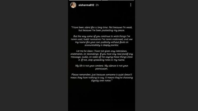 She continued, "Let me be clear: I have not given any interviews, statements ore recordings. If you have any real proof, any message, audio or video of me saying these things, show it. If not, stop spreading news in my name. My life is not your content. Mysilence is not your permission." She concluded by saying, "Just because someone is quit doesn't mean they have nothing to say. It means they are choosing dignity over noise." Aishwarya Sharma and Neil Bhatt Tbilisi Diary: 'Ghum Hai Kisikey Pyaar Meiin' Actors Share 'Masala' Moments From Their Vacation in Georgia.
