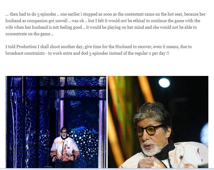 He wrote on his blog: “.. then had to do 3 episodes .. one earlier i stopped as soon as the contestant came on the hot seat, because her husband as companion got unwell .. was ok .. but I felt it would not be ethical to continue the game with the wife when her husband is not feeling good .. it would be playing on her mind and she would not be able to concentrate on the game..(sic).”