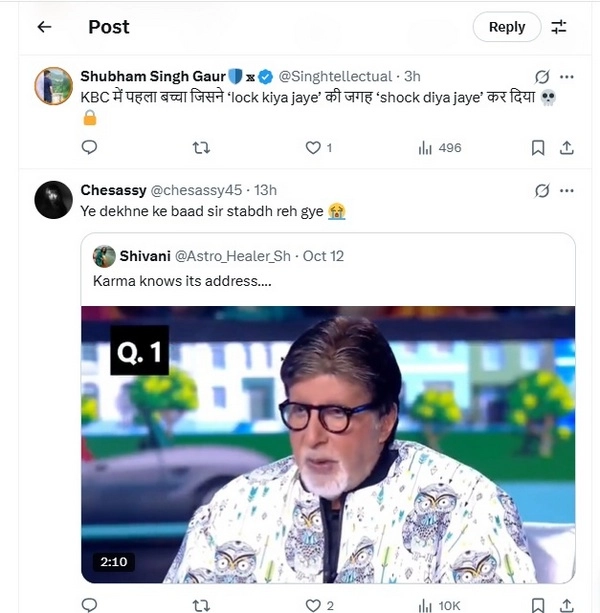 A user on X observed that the new generation needs to learn manners rather than the ‘lifeline’ on KBC. He wrote, “सर, इस पीढ़ी को ‘लाइफ़लाइन’ नहीं, ‘मैनर्सलाइन’ की ज़रूरत है (Sir, this generation does not need a ‘Lifeline’ (referring to the quiz show), it needs a ‘Mannersline’)”. He also tweeted, “KBC में पहला बच्चा जिसने ‘lock kiya jaye’ की जगह ‘shock diya jaye’ कर दिया 💀🔒 (It’s the first time that a child on KBC, instead of ‘Lock’ (the option) from the show, decided to ‘Shock’)”.