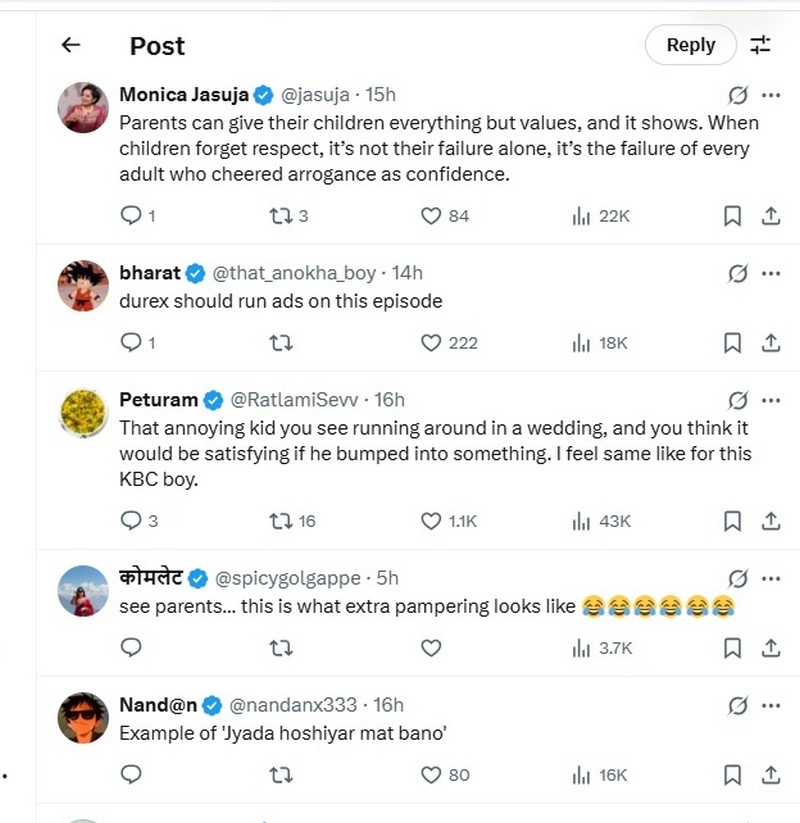 A user commented on the KBC Junior Week clip from KBC 17 posted by influencer Sagarcasm, “Parents can give their children everything but values, and it shows. When children forget respect, it’s not their failure alone, it’s the failure of every adult who cheered arrogance as confidence.” “Example of 'Jyada hoshiyar mat bano'”, read another tweet about the boy. “see parents… this is what extra pampering looks like 😂😂😂😂😂😂”, posted another X user. "This is how he talks to his parents at home," tweeted another user.