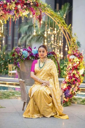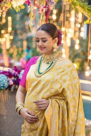 We have been raving about Surveen Chawla's recent appearances. The actress has been flaunting some stunning looks which pregnant women can definitely take cues from. For her godbharai ceremony which took place recently, Surveen looked resplendent and beaming with joy. She wore both western and traditional outfits for the ceremony and we must say, we loved her in both avatars. Surveen chose to wear a pink and yellow saree and teamed it up with golden jewellery. As for the western look, she opted for a peach coloured gown and we couldn't help but notice how radiantly her skin is glowing in pregnancy. The to-be mommy looks gorgeous in all these pics and we'd love for you to see them too. And if you are planning to have a godbharai too, you can definitely refer to Surveen's style file. Surveen Chawla Shows Off Her Baby Bump In a 'Bumpie' With Husband Akshay Thakkar.