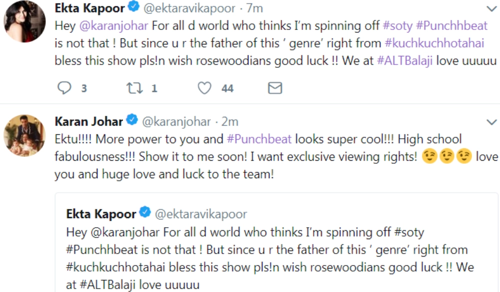 Does Puncchbeat feel like another version of Student of The Year? Ekta however, feels differently. A few months back when the lady was bombarded on social media for adapting SOTY on the web space, she’d tweeted to good friend Karan Johar and also went ahead to seek his blessings as he was the ‘God’ of the genre. And the latter had blessed the show too.