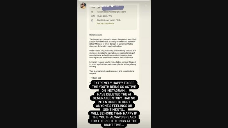 Television actress Rashami Desai has removed an AI-generated post on Home Minister Amit Shah and Chief Minister of West Bengal Mamata Banerjee from her Instagram account after concerns were raised over its content. The actress took to Instagram to share that she had received a communication expressing concern over the images, which reportedly featured senior political leaders and were termed inappropriate and misleading. Fact Check: Did Deepika Padukone Celebrate Her 40th Birthday in Intimate Bash With Besties Alia Bhatt and Shraddha Kapoor? Here’s the TRUTH Behind Viral Photos on X.