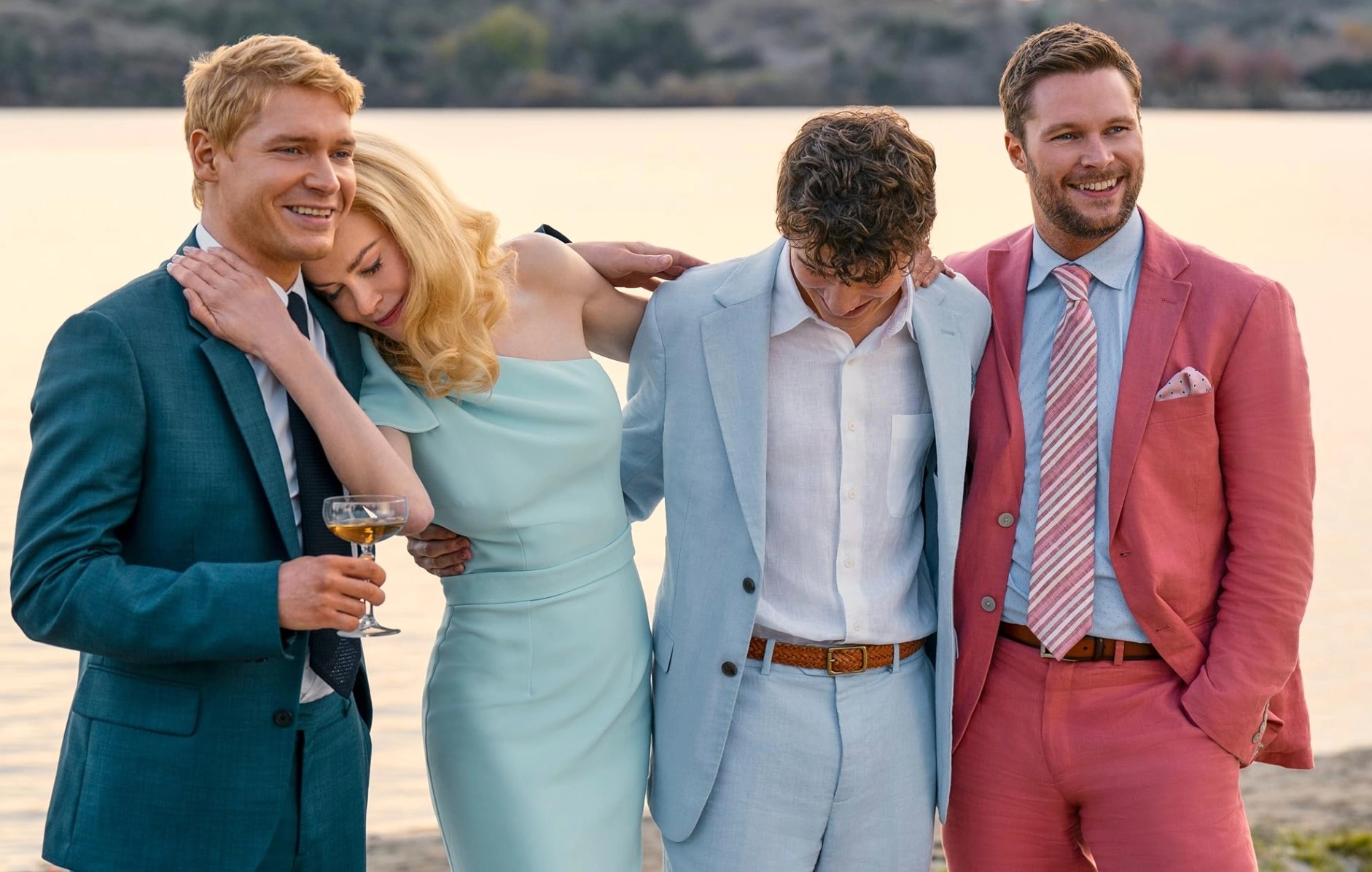 The basic plot premise remains the same: on the morning of Benji's (Billy Howle) and Amelia's (Eve Hewson) wedding, the bride's best friend, Merritt (Meghann Fahy), is found dead, floating in the lake near the Winsbury family's private residence. The suspects include various family members and friends staying at the estate that also includes Isabel Nallet (Isabelle Adjani), who is having a discreet affair with the groom's debt-ridden, erratic older brother, Thomas (Jack Reynor), and Shooter Dival, the groom's best man, who has feelings for the bride.