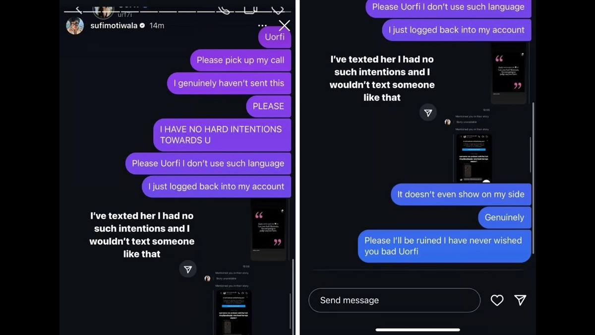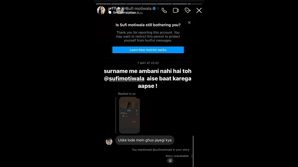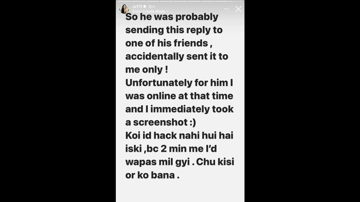 Uorfi shared another Instagram story, suggesting that Motiwala's offensive comment was intended for someone else but was accidentally sent to her. Her post read, "So he was probably sending this reply to one of his friends, accidentally sent it to me only! Unfortunately for him I was online at that time and I immediately took a screenshot :) Koi id hack nahi hui hai iski, 2 min mein id vapas mil gayi. Chu kisi aur ko bana." Although Uorfi deleted both stories shortly after posting, screenshots have been widely circulated on social media.