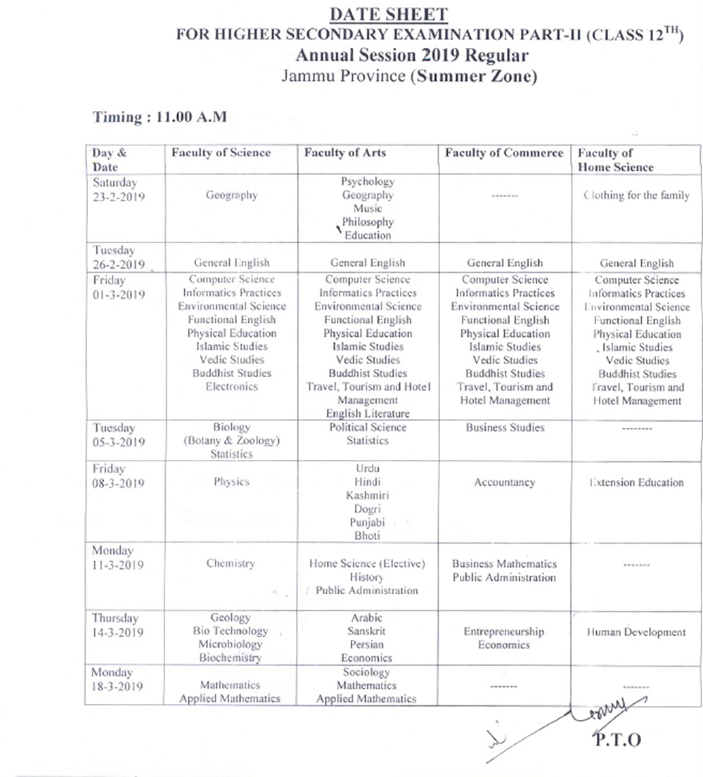 JKBOSE Class 12 Board Exam Date Sheet 2019 (Summer Zone)