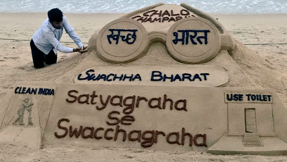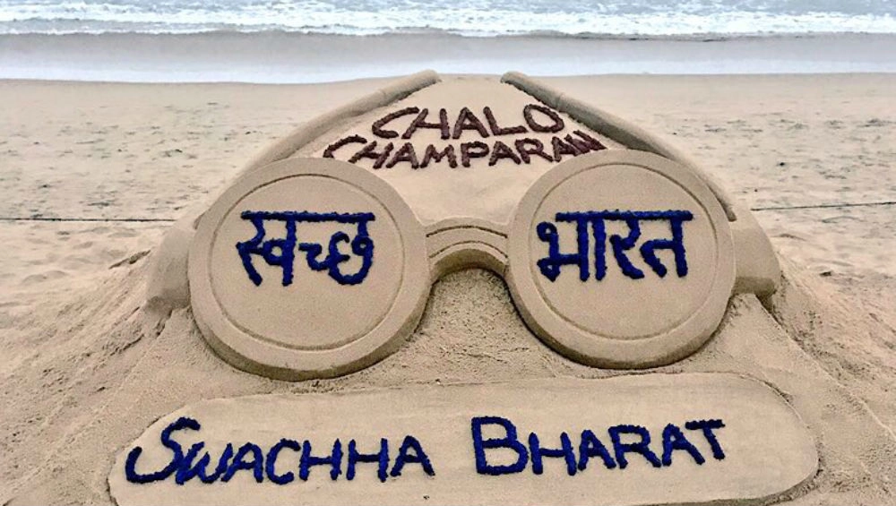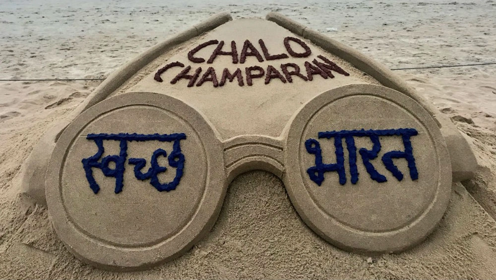Puri, April 10: Globally acclaimed sand artist Sudarsan Pattnaik on Tuesday made a sand art to commemorate the concluding ceremony of the Champaran Satyagraha. The renowned artist showcased his art at Odisha’s Puri beach with messages saying ‘Chalo Champaran’ and ‘Satyagraha Se Swachhagraha’ for Swachh Bharat initiative. The artist also appealed people of the nation to join the pathbreaking initiative.