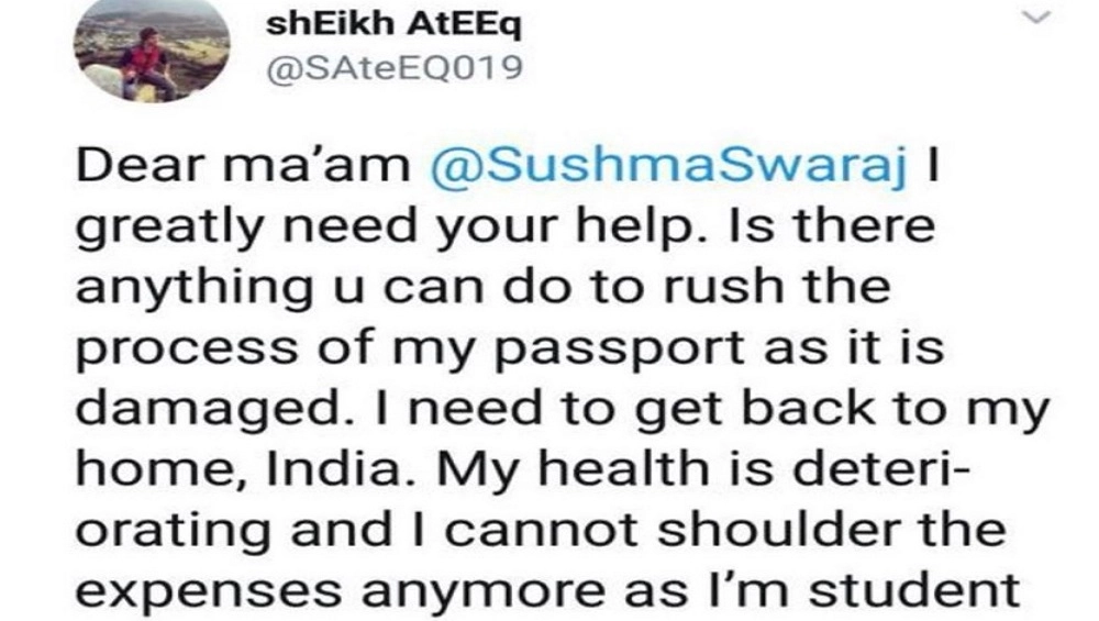 Ateeq sought help from Swaraj for help on April 5. “Dear ma’am @SushmaSwaraj I greatly need your help. Is there anything u can do to rush the process of my passport as it is damaged. I need to get back to my home, India. My health is deteriorating and I cannot shoulder the expenses any more as I’m student (sic),” he said in his earlier tweet.