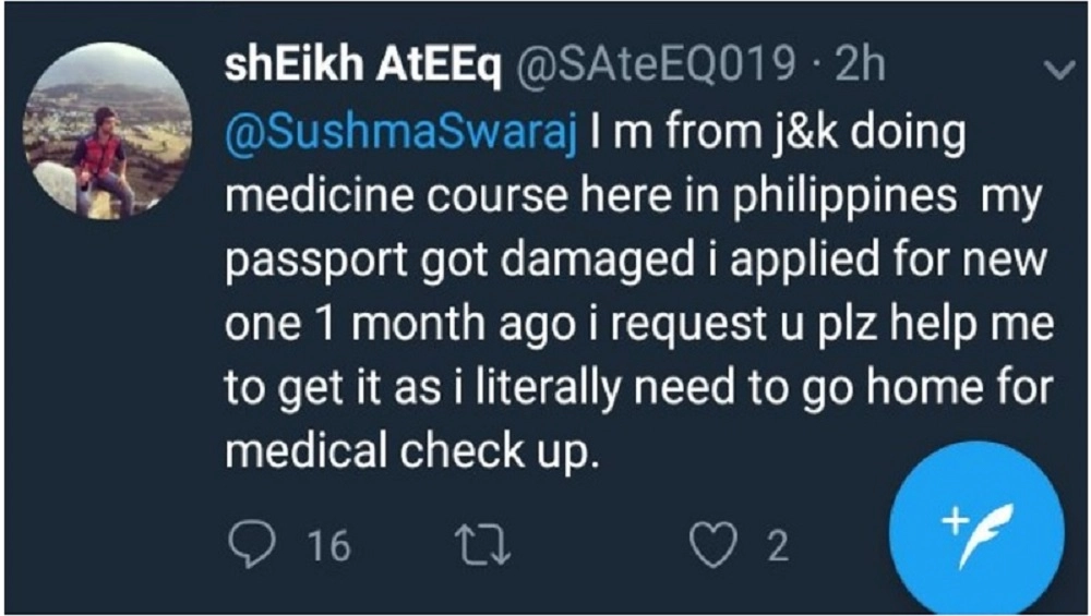 Ateeq tweeted, “I am from J&K doing medicine course here in Philippines my passport got damaged I applied for new one 1 month ago I request u pls help me to get it as i literally need to go home for medical checkup (sic).”