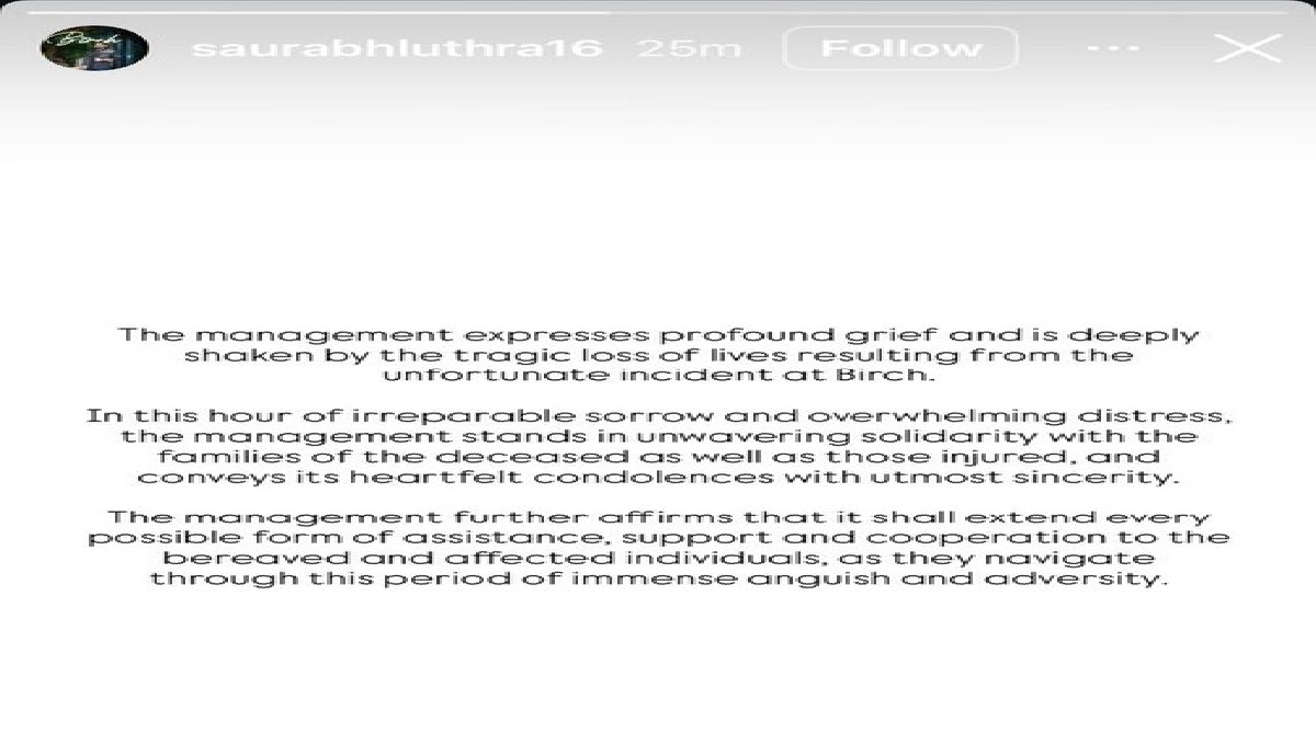 Meanwhile, Goa Chief Minister Pramod Sawant announced an ex-gratia of INR 5 lakh each for the victims' kin, who lost their lives in the deadly fire at Birch by Romeo Lane in Arpora. He also said that his government will ensure that disciplinary action is taken against the culprit. Sawant also added that the government does not promote any illegal nightclub. In the wake of the incident, Saurabh Luthra has issued a statement and said that the management stands in solidarity with the families of the deceased and the injured.