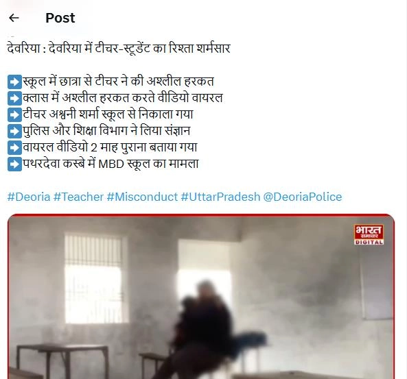 Deoria, February 19: A shocking video from Deoria district in Uttar Pradesh has triggered outrage after a private school teacher was allegedly caught on camera engaging in inappropriate behaviour with a female student. The incident reportedly took place in the Pathardeva block area and has raised serious concerns about student safety in private schools.