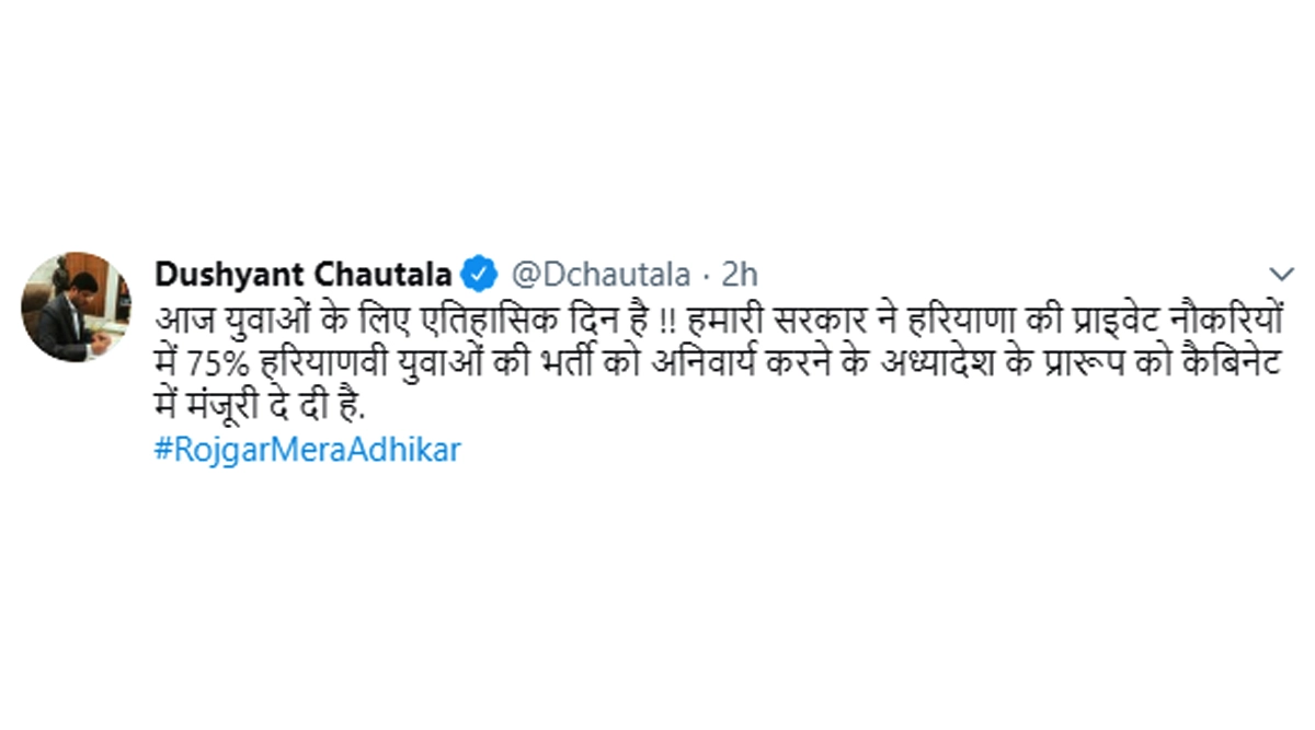 Chandigarh, July 6: Haryana Deputy Chief Minister Dushyant Chautala on Monday said the state cabinet has approved a draft of an ordinance mandating 75 percent quota for locals in private jobs. "Historic day for youths. Our government has approved the draft of the ordinance mandating the recruitment of 75% youth from the state in private jobs in Haryana," Dushyant Chautala tweeted. The issue of reservation for locals in private jobs in Haryana had been discussed by the state cabinet in February this year and Dushyant Chautala was asked to make a draft proposal. The move is on the lines of the law enacted by YS Jaganmohan Reddy government in Andhra Pradesh.