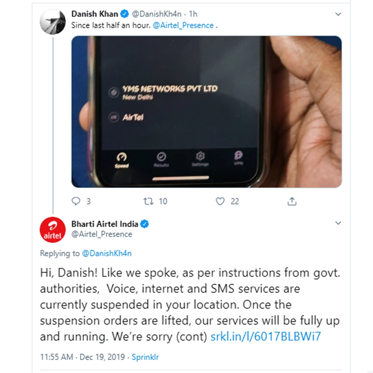Danish Khan, a resident of North East Delhi, complained about internet blockade tagging Airtel on Twitter. Replying to Khan, Airtel wrote: "Hi, Danish! Like we spoke, as per instructions from govt. authorities, Voice, internet and SMS services are currently suspended in your location. Once the suspension orders are lifted, our services will be fully up and running. We’re sorry about the inconvenience. Thanks for your support! Prabhjot." Citizenship Act 1955 - Citizenship Amendment Act 2019 Full Text: Know Two Laws About Indian Citizenship.