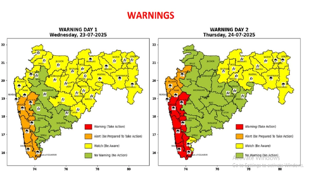 The weather agency has also extended the red alert for Raigad and Ratnagiri till Friday, July 25. Besides red and orange alerts, IMD has also issued green alerts for several districts of Maharashtra on Thursday, July 24. These include Dhule, Nandurbar, Jalgaon, Nasik, Pune and Satara, among others, predicting light to moderate rainfall in these areas. Weather Forecast Today, July 23: Check Weather Updates, Heatwave Warning, Rain Predictions for Mumbai, Delhi, Chennai, Bengaluru, Hyderabad, Shimla and Kolkata.