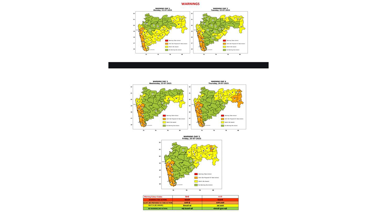 Residents of Maharashtra can check the IMD forecast above to see the names of the districts under Orange and Yellow alert from today, July 21, to Friday, July 25. "The warnings are issued based on the latest observations and numerical weather prediction model guidance available," IMD said. Meanwhile, civic officials said that heavy rains lashed Mumbai overnight, causing waterlogging in some low-lying areas. The heavy downpour also led to a slowdown in vehicular movement in parts of the city.