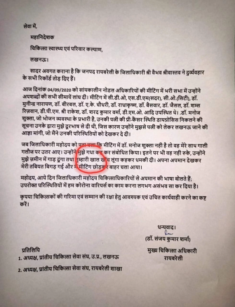 The letter starts by saying, "The District Magistrate of Rae Bareli, Vaibhav Srivastava, has broken all records of misbehaviour. The disrespect shown to me caused me distress and I left the meeting".