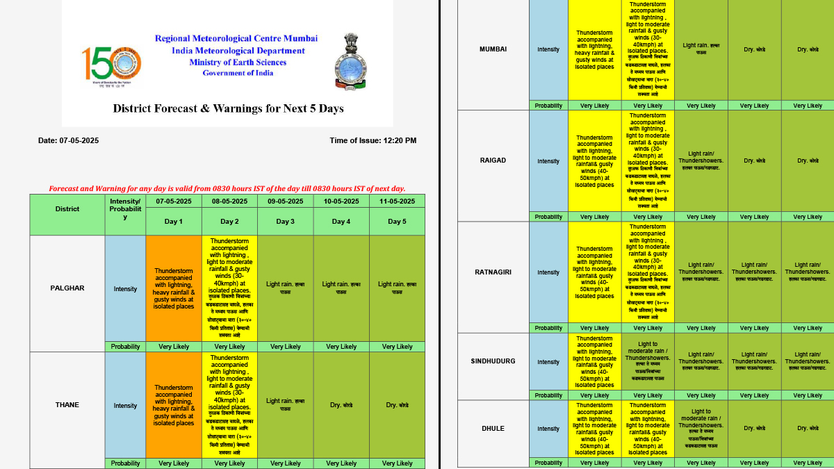 Mumbai, May 07: The India Meteorological Department (IMD) has issued a Yellow alert for Mumbai, Thane, and Palghar for May 8, warning of potential thunderstorms and moderate rainfall. This alert extends to multiple districts in Maharashtra, with Orange alerts in place for Pune, Nasik, Jalgaon, and Dhule, where isolated hailstorms, lightning, and gusty winds (50-60 kmph) are expected.