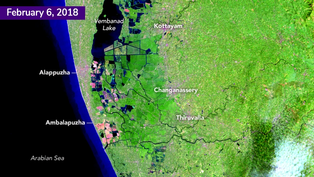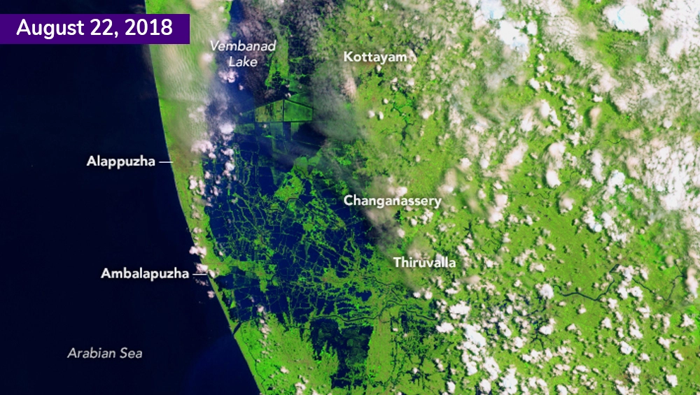 The shocking visuals released by NASA shows the destruction at places like Alappuzha, Kottayam, Changanassery and Thiruvalla surrounding the Vembanad lake.