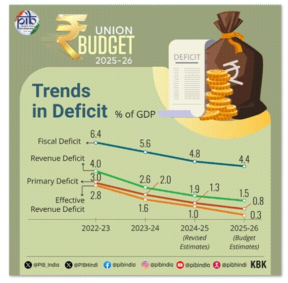 Reiterating the commitment to stay the course for fiscal consolidation, the Union Finance Minister stated that the Government endeavours to keep the fiscal deficit each year such that the Central Government debt remains on a declining path as a percentage of the GDP and the detailed roadmap for the next 6 years has been detailed in the FRBM statement. Smt. Sitharaman stated that the Revised Estimate 2024-25 of fiscal deficit is 4.8 per cent of GDP, while the Budget Estimates 2025-26 is estimated to be 4.4 per cent of GDP.
