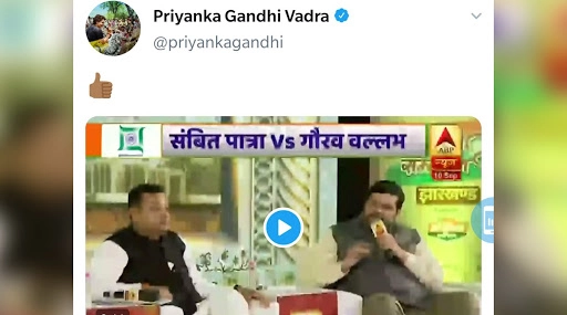 Priyanka, without giving any caption to the video, only used a "thumb emoji" to mock Patra over his inability to tell the number of zeros in a trillion. The debate was aired on September 10 on ABP News on the occasion when the Modi government completed 100 days in power after winning the Lok Sabha elections 2019.